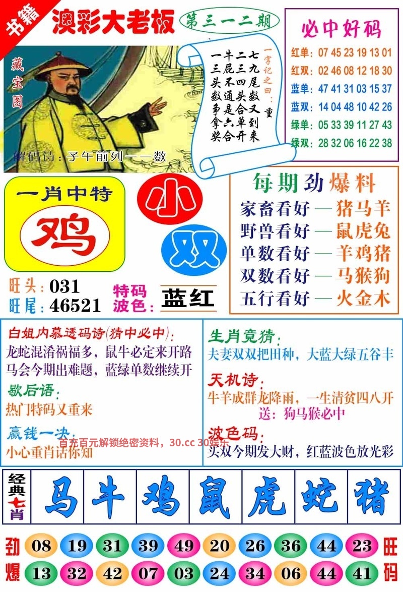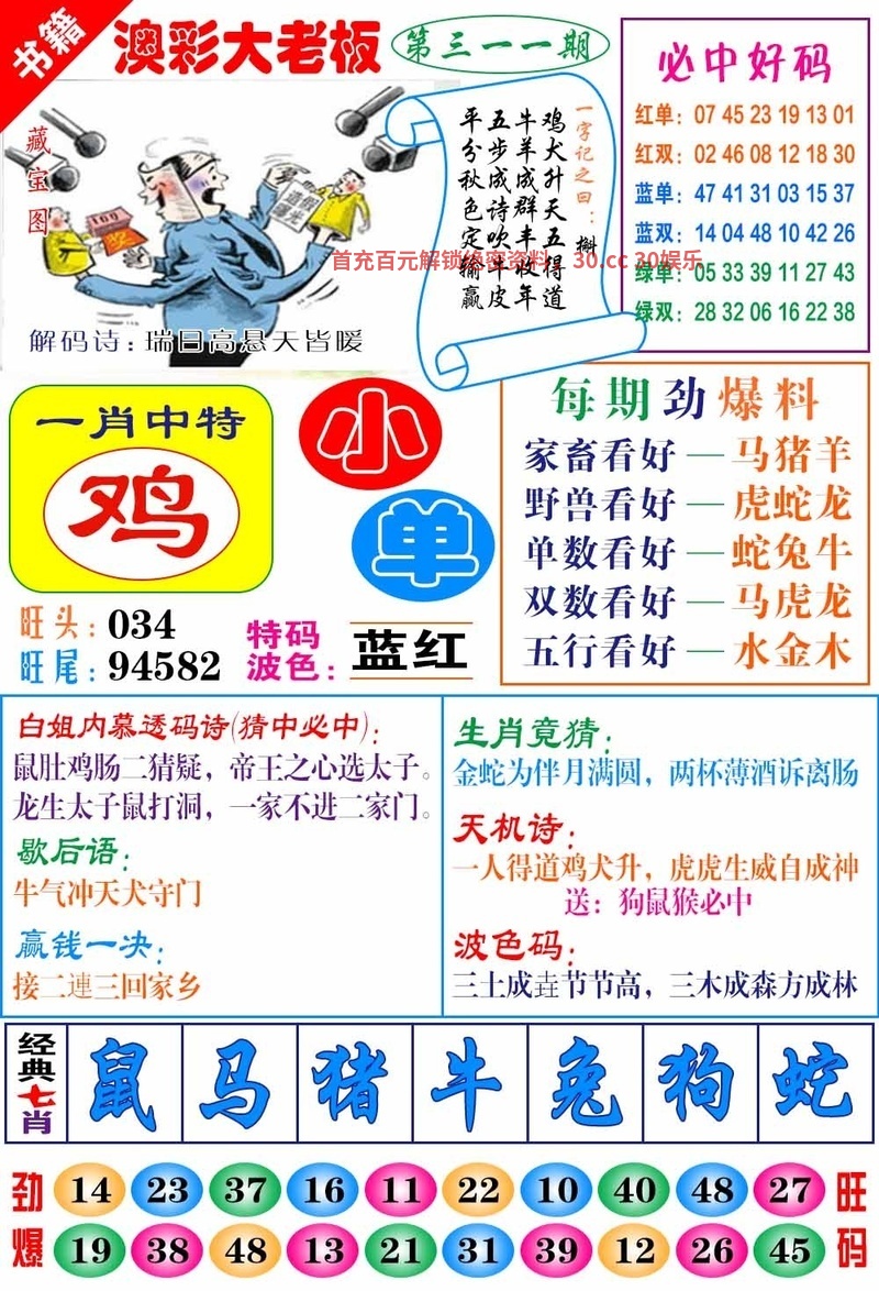 311期:七肖【鸡狗鼠猪羊龙】开:蛇37